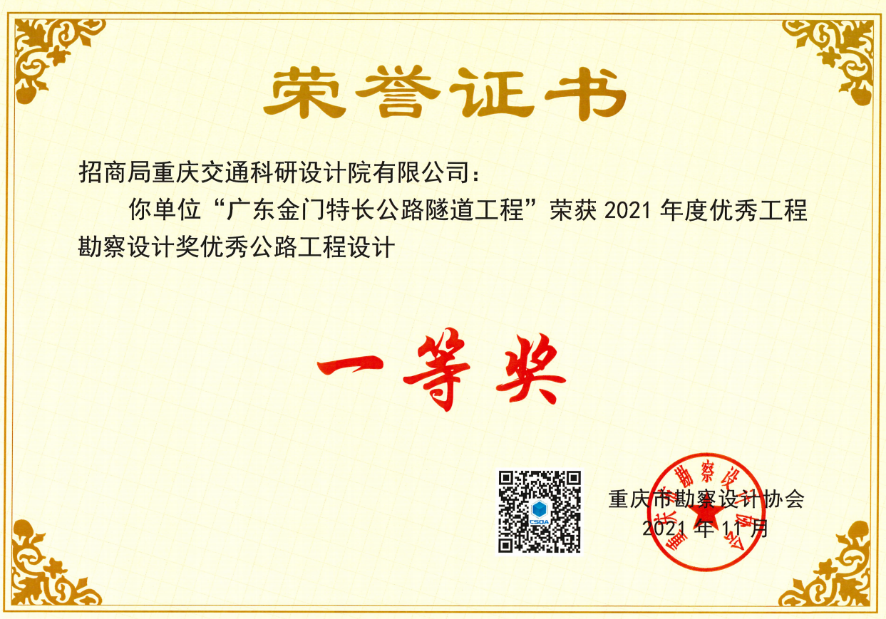 近日,重慶市勘察設(shè)計協(xié)會頒發(fā)了2021年度優(yōu)秀勘察設(shè)計獎證書和獎牌。招商交科獲設(shè)計獎6項。其中,一等獎1項:廣東金門特長公路隧道工程。二等獎5項:漳州沿海大通道(濱海一級疏港公路)龍海段、國道321線