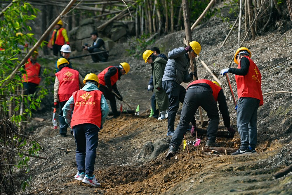 為了保護當?shù)貧埓娴闹参锬茉诖禾彀残纳L,防止大型機械作業(yè)時對山林的破壞和態(tài)環(huán)境的干擾,同時兼顧當?shù)鼐用裆铰吠ㄐ行枨螅猩探豢浦驹刚呖侩p手修繕山林步道,用人力守護綠色山林。