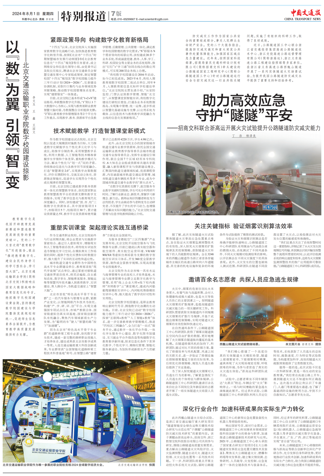 8月1日,《中國交通報》“特別報道”刊發(fā)了《助力高效應(yīng)急 守護(hù)“隧隧”平安——招商交科聯(lián)合浙高運(yùn)開展火災(zāi)試驗(yàn)提升公路隧道防災(zāi)減災(zāi)能力》文章。在當(dāng)前國家高度重視公共安全與防災(zāi)減災(zāi)工作的背景下,公路隧道作為交通運(yùn)輸?shù)闹匾ǖ溃浒踩c防災(zāi)能力直接關(guān)系到人民群眾的生命財產(chǎn)安全。招商交科聯(lián)合多家單位,在浙江省義東高速公路西甑山隧道開展了一系列火災(zāi)試驗(yàn),旨在提升我國公路隧道防災(zāi)減災(zāi)水平,守護(hù)公共安全。現(xiàn)將全文轉(zhuǎn)載如下: