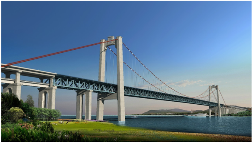 五峰山長江大橋位于江蘇鎮(zhèn)江,大橋主跨1092米,主橋?yàn)榧觿配撹炝簯宜鳂?;全橋主纜索股2×336束,每束索股由127根直徑為5.5毫米鍍鋅高強(qiáng)鋼絲組成,索股長度1932米,索股總重超過3.3萬噸。